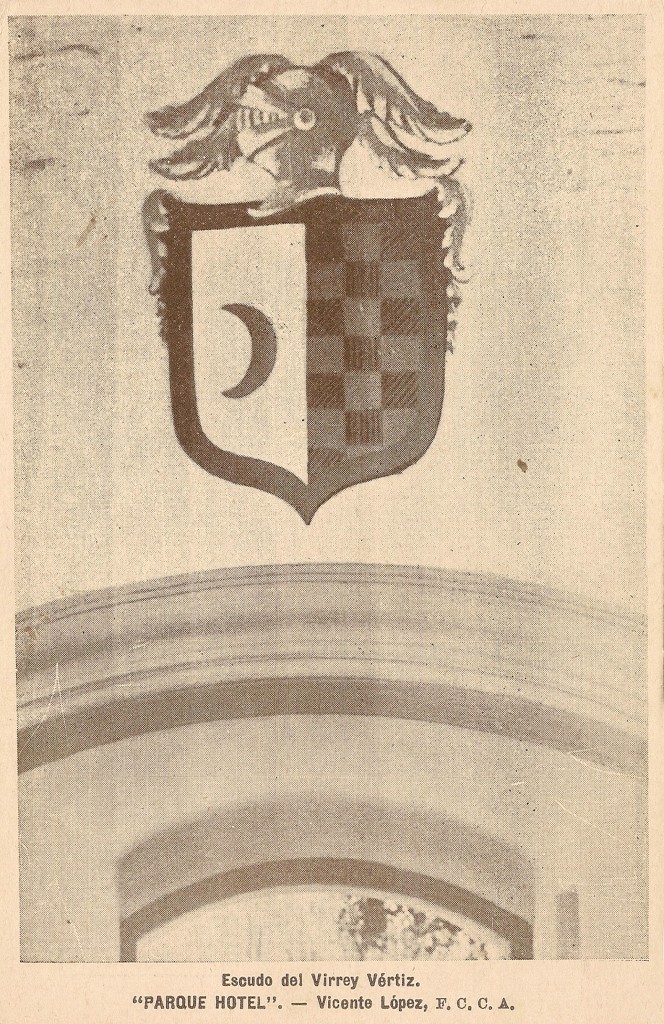 Postal con el escudo del Virrey Vértiz en el Parque Hotel de Vicente López. Este hotel fue parte de lo que anteriormente fue la quinta San Antonio, un lugar que el virrey destinaba para su descanso. Luego, con nuevos propietarios, funcionaría el Hotel Edén que cambiaría hacia la década de 1930 su nombre por el de Parque Hotel. Sin embargo, en 1934, el mismo sería demolido.