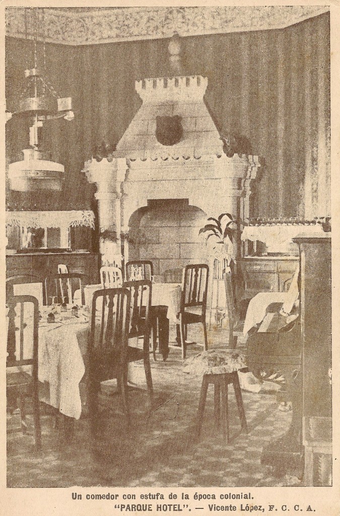 Esta postal de la década de 1920, muestra el comedor con una estufa de época colonial del Parque Hotel.
