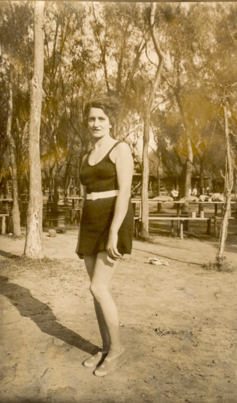 En esta imagen, de principios de los años cuarenta, una mujer posa en una playa de Olivos. A sus espaldas, se vislumbran las instalaciones y el entorno característico de este lugar a orillas del río. Desde comienzos de los años veinte y hasta la década de los ochenta inclusive, Vicente López fue una ciudad balnearia con asidua asistencia tanto de vecinos como personas que venían de otras localidades.