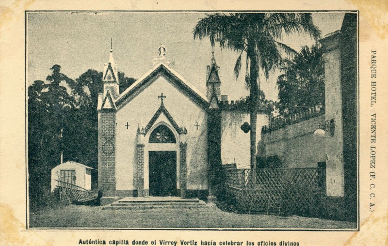 La postal muestra la capilla del Parque Hotel, que inicialmente sirvió como lugar para los oficios divinos presididos por el Virrey Vertiz en la quinta San Antonio. Esta quinta, destinada al descanso del virrey, se transformó en la década de 1920 en el Hotel Edén, posteriormente conocido como Parque Hotel en los años 30. Sin embargo, en 1934, esta estructura histórica fue demolida.