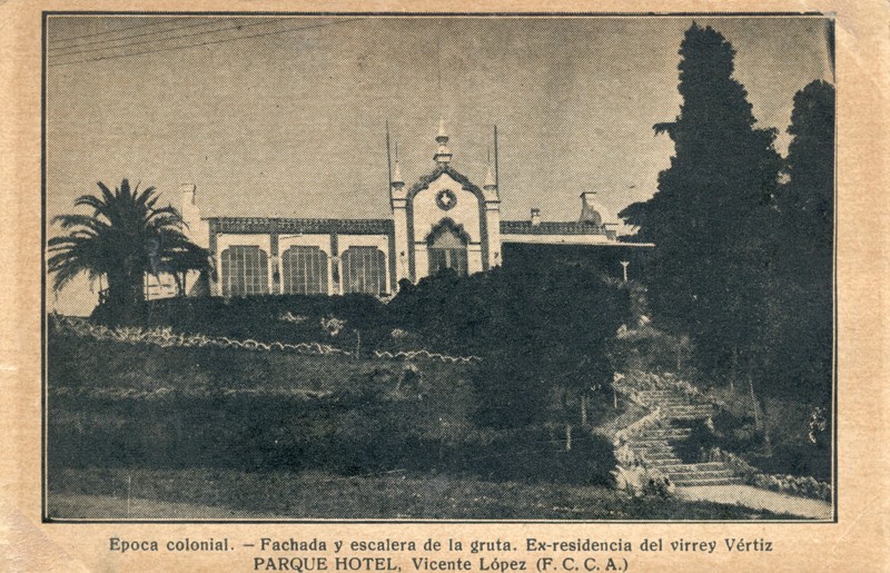 Esta fotografía muestra la fachada y escalera de la gruta que pertenecieron al Parque Hotel, previamente conocido como el Hotel Edén. Posteriormente, hacia el año 1934, el hotel sería demolido.