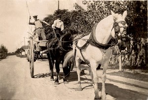 La imagen retrata a Victorio Sciaini en su carro, sosteniendo su rebenque, una herramienta de trabajo esencial en su oficio.