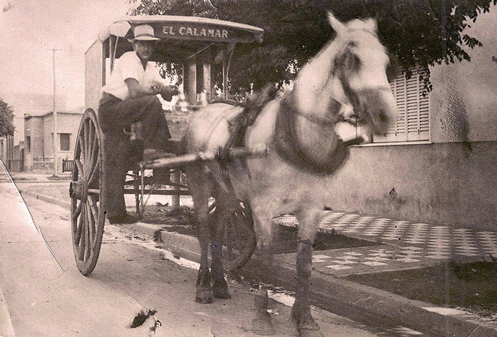 En esta fotografía vemos al Sr. Novoa realizando el reparto de leche con su característico carro El Calamar, cuyo nombre hace alusión al Club Atlético Platense. Fue una personalidad destacada de Villa Martelli por su peculiar y necesaria labor.
