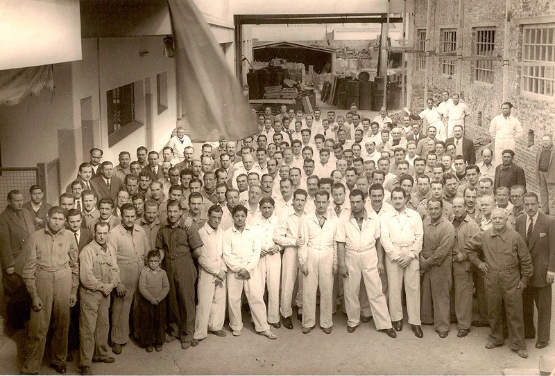 En esta imagen, se observa una reunión de trabajadores en la fábrica Champion, un destacado fabricante de baterías, acumuladores eléctricos y afines, en Villa Martelli.