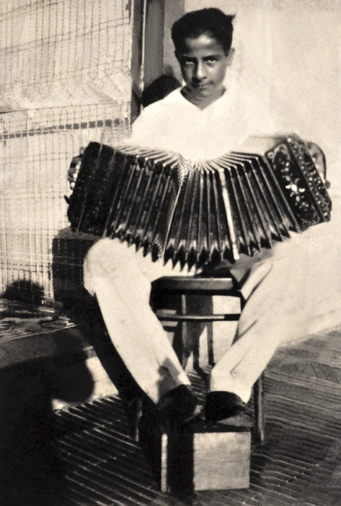 El niño Aquiles Pane, tocando su bandoneón, en la esquina de Chacabuco y Roca, barrio de Florida.