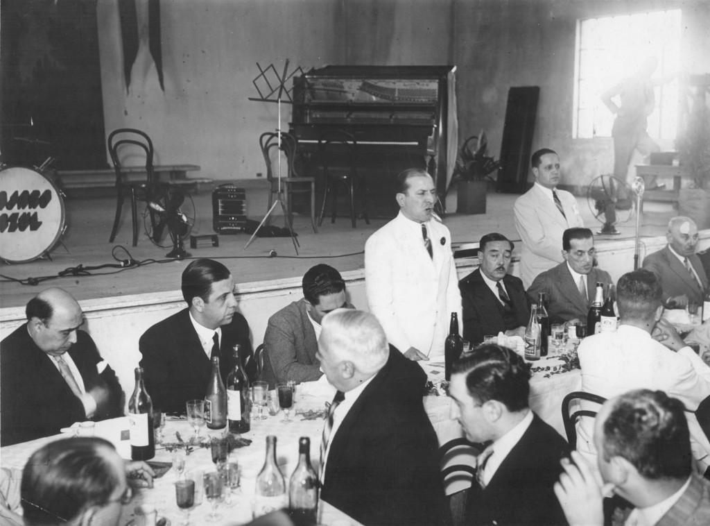 Roberto Uzal, intendente y comisionado de Vicente López en diversas ocasiones entre los años 1936 y 1943, hace uso de la palabra en el octavo aniversario del Centro Comercial de Vicente López. Entre otros, lo acompaña el presidente de la Cámara de Diputados de la Provincia de Bs As.