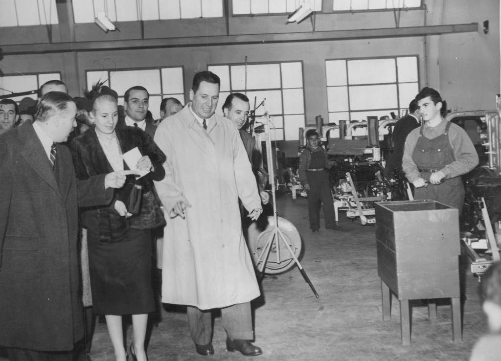 El presidente de la Nación, Juan Domingo Perón, María Eva Duarte y el ministro de Transporte, Coronel Juan F. Castro, durante el acto de inauguración el 16 de junio de 1950 de la Escuela Fábrica Nº 2 María Eva Duarte de Perón