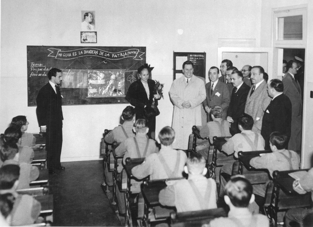María Eva Duarte acompañada por el presidente Juan Domingo Perón, Cecilio Conditti, Secretario General del Sindicato de Textiles, el Coronel Castro y Héctor J. Cámpora, presidente de la Cámara de Diputados, Durante el acto de inauguración el 16 de junio de 1950 de la Escuela Fábrica Nº 2 María Eva Duarte de Perón.