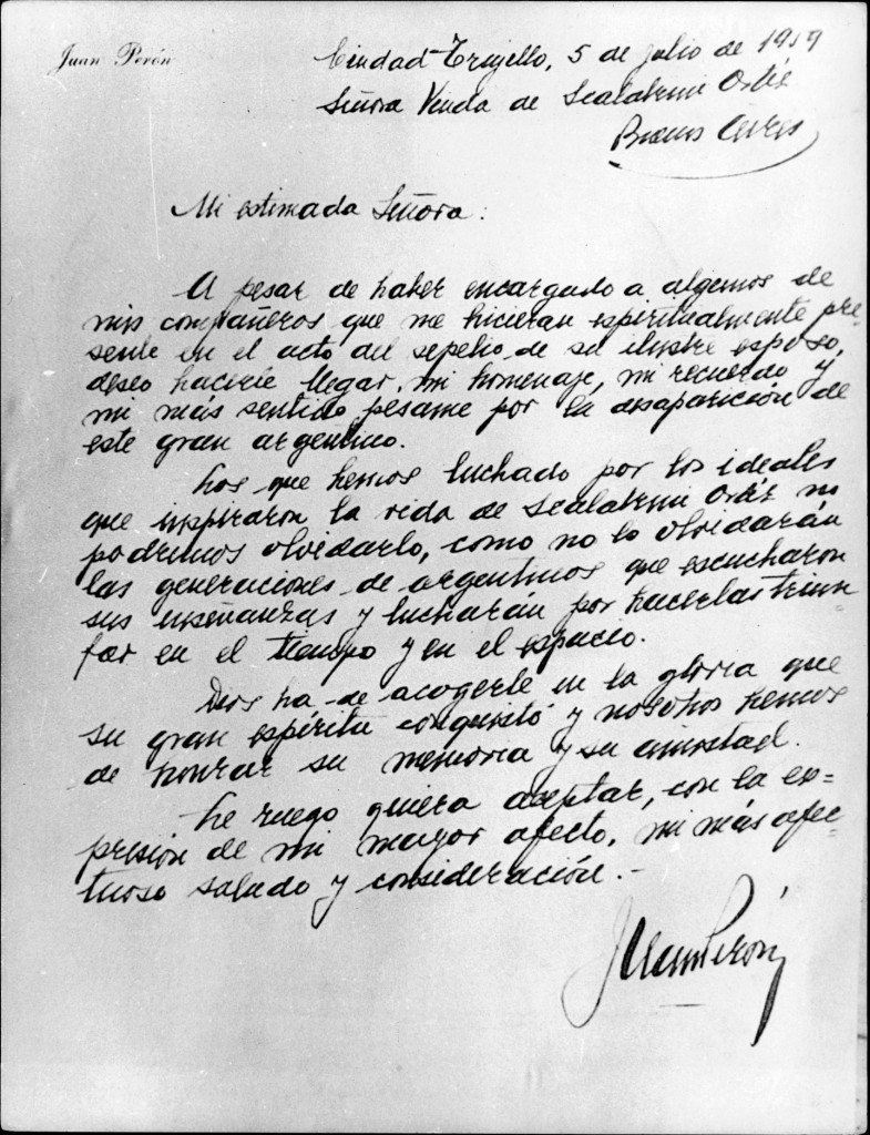 Carta de Juan Domingo Perón a Mercedes Comaleras, viuda de Raúl Scalabrini Ortiz, con motivo del fallecimiento de su esposo.