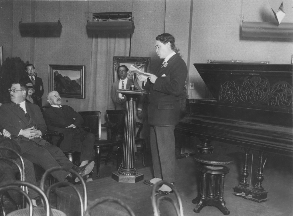 Domingo Fernández Beschtedt, alias Fernán Félix de Amador, durante una disertación. Fue un escritor, poeta y periodista argentino que se desempeñó como profesor en la Escuela Nacional de Artes de Buenos Aires y la Universidad de La Plata. Además. escribió diversos libros, entre ellos "El libro de Horas" y "Las lámparas de arcilla". Murió el 26 de diciembre del año 1954, en Olivos.