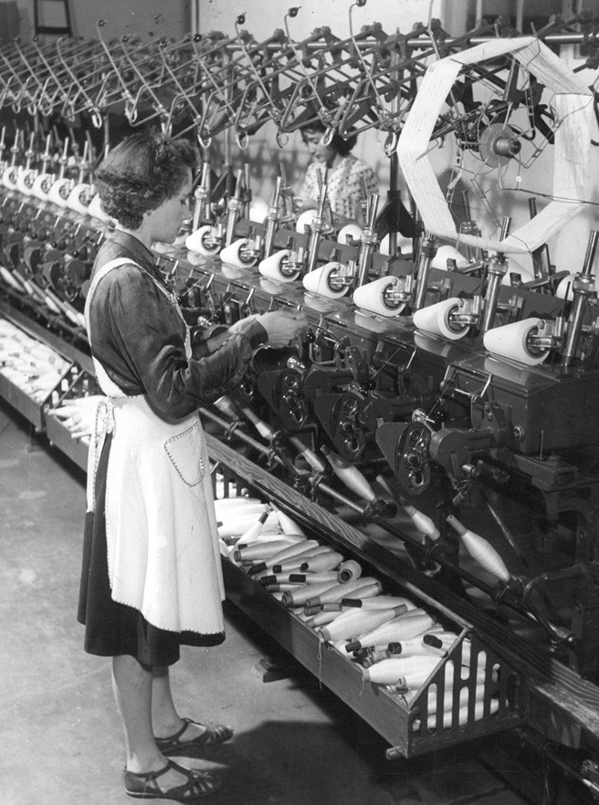 Mujeres trabajando en la fábrica textil Sedalana, en la sección devanadora de hilos.