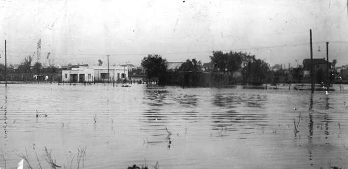 Esta fotografía muestra calles desbordadas en las cercanías del puerto de Olivos durante el temporal del año 1959.