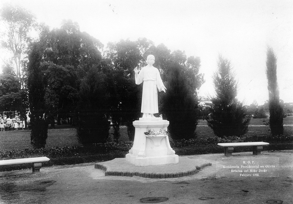 Estatua del niño Jesús ubicado en los jardines de la Residencia Presidencial de Olivos, en febrero de 1935.