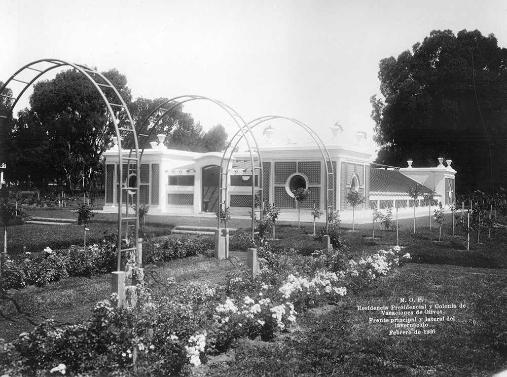 Frente principal y lateral del invernáculo de la residencia presidencial hacia febrero del año 1936. El terreno de la quinta fue donado por Carlos Villate Olaguer, su antiguo propietario, para que fuera utilizada por los futuros gobernantes de la nación como su residencia de verano.