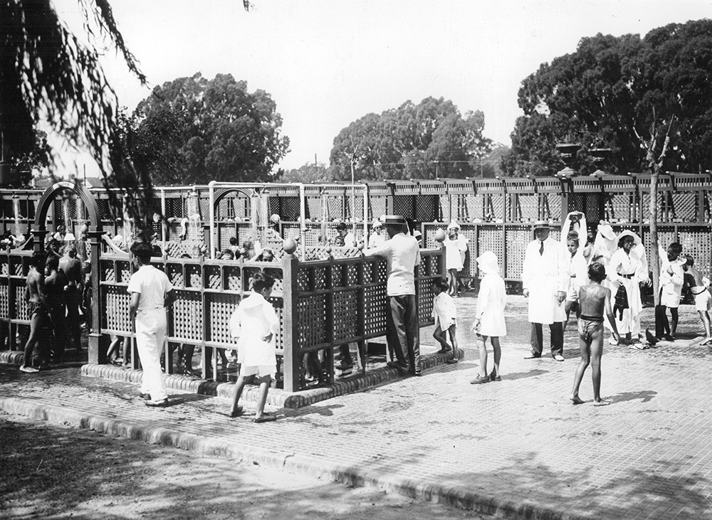 Los niños de la colonia de vacaciones se duchan en la Quinta Presidencial de Olivos después de disfrutar del río. El terreno de la quinta fue donado por Carlos Villate Olaguer, su antiguo propietario, para que fuera utilizada por los futuros gobernantes de la nación como su residencia de verano. La donación fue aceptada en el año 1918 por el entonces Hipólito Yrigoyen (mandato 12/10/1916 - 12/10/1916 y 12/10/1922 - 6/9/1930).