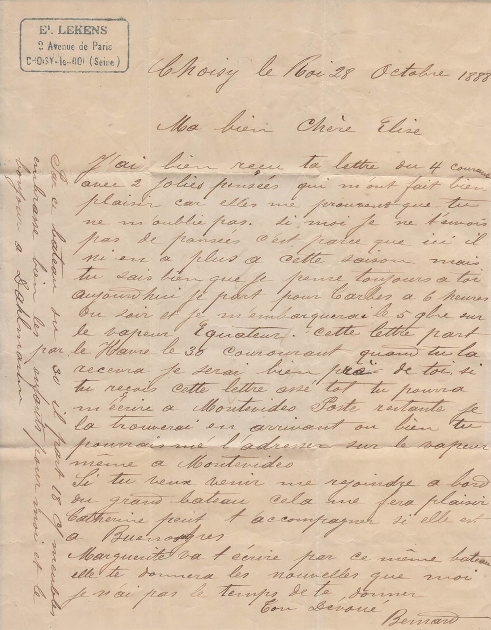 Carta en francés de Bernardo Ader a su esposa Elise Schulze.