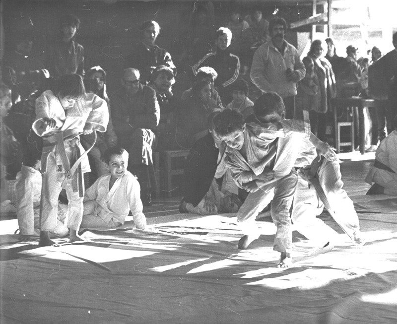 Niños practicando taekwondo en el Club Defensores de Olivos hacia fines de la década de 1980.