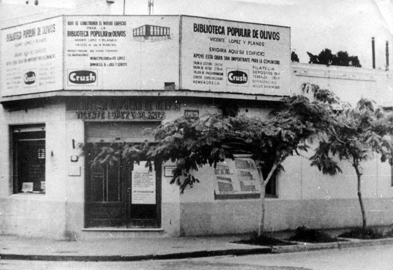 Frente de la Biblioteca Popular de Olivos Vicente López y Planes, ubicada en la intersección de la Avenida Maipú y la calle Roque Sáenz Peña. La entidad fue fundada el 09 de octubre de 1921 con el fin de garantizar el acceso de la población a la lectura y promoverla.