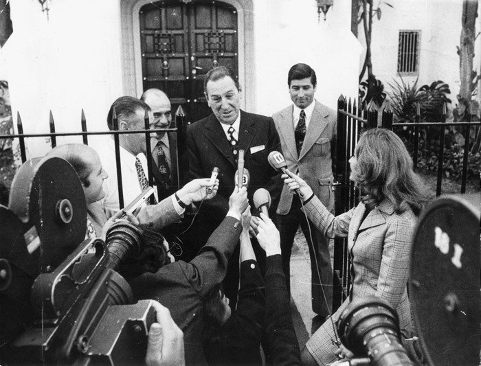 El presidente electo, Juan Domingo Perón, realiza declaraciones en su residencia de Gaspar Campos.