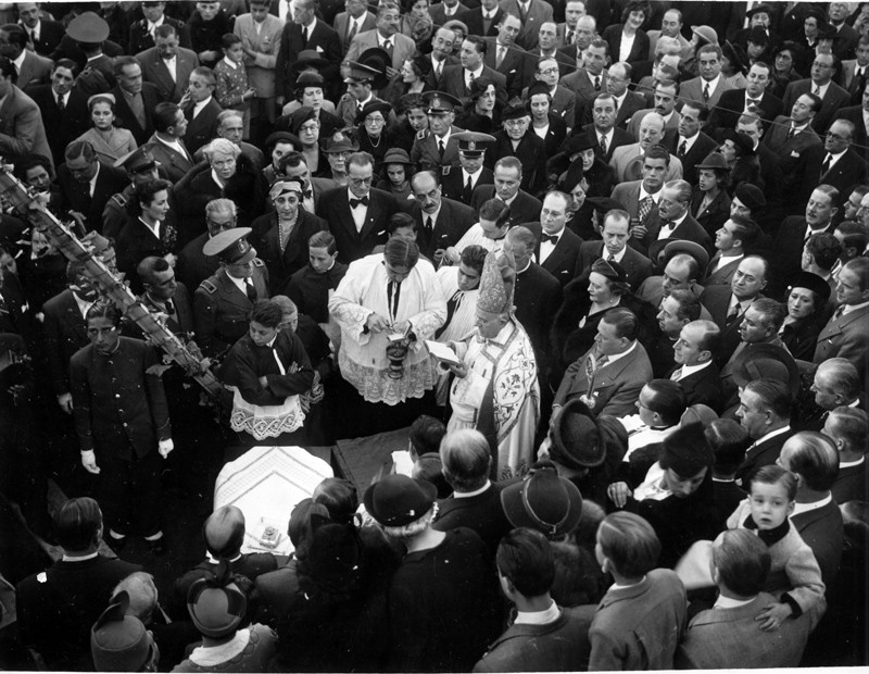 El cardenal Santiago Luis Copello bendiciendo la piedra fundamental de la que luego sería la Parroquia Jesús en el Huerto de los Olivos.