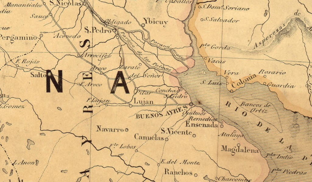 Mapa de la República Argentina mostrando la línea del FFCC proyectado en el Río Paraná y Córdoba, año 1855. Allí figura la zona norte de la provincia de Buenos Aires, en particular el partido de San Isidro al cual pertenecía Vicente López hasta su creación el 21 de diciembre de 1905.