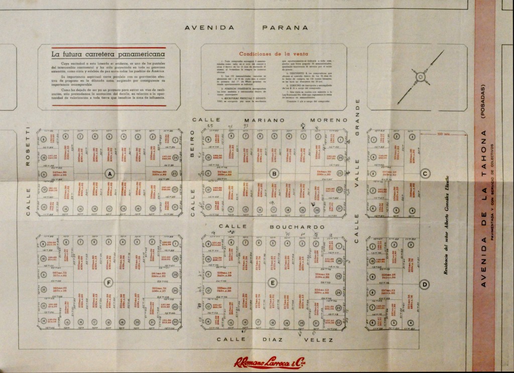 Mapa de lotes incluido en un folleto publicitario de la década de 1920, que promocionaba la venta de terrenos en las calles Díaz Vélez y Rosetti, y en las avenidas De la Tahona, actualmente Avenida Cnel. Roberto M. Uzal, y Paraná.
