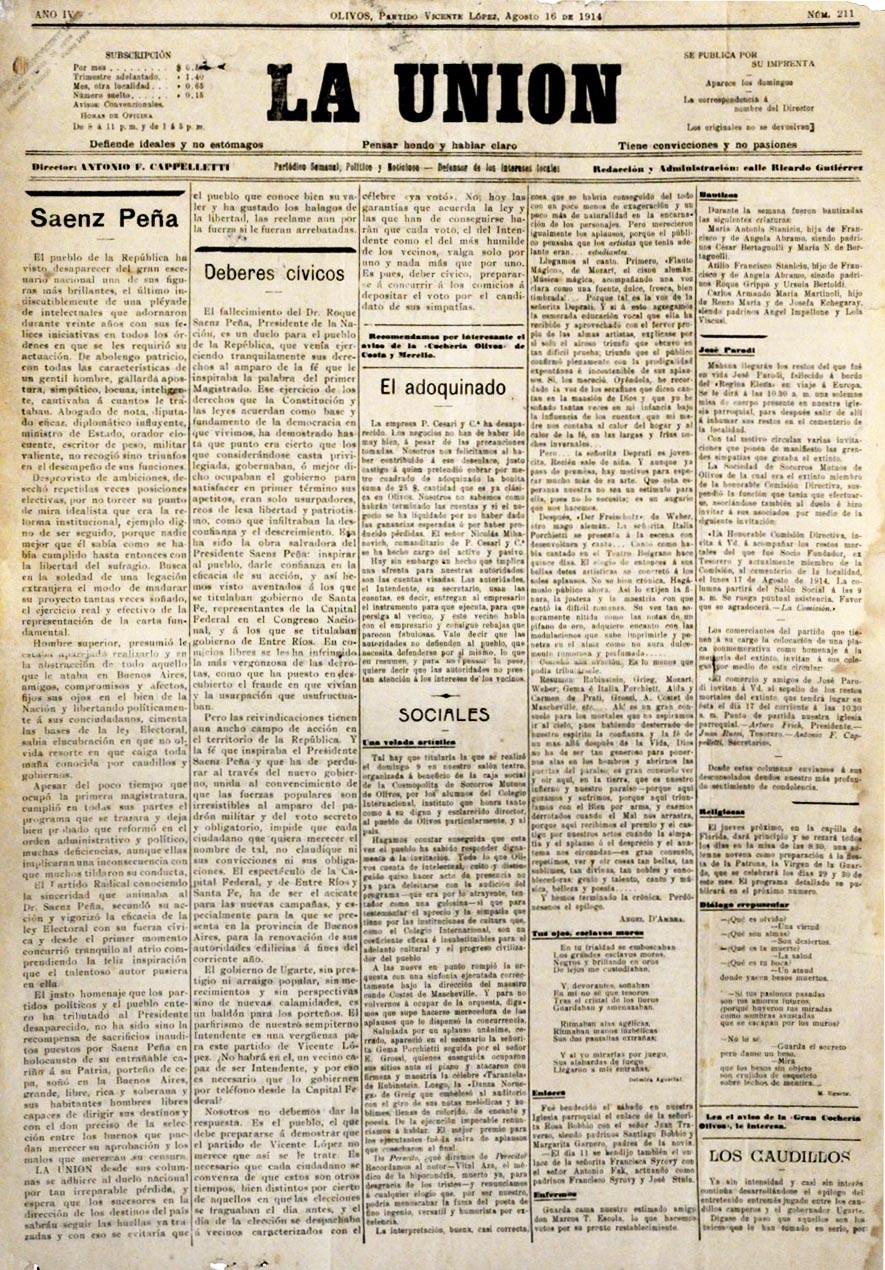El documento corresponde al periódico La Unión, edición n.º 211, publicado en Olivos, el 16 de agosto de 1914. Este periódico semanal, dirigido por Antonio F. Cappelletti, tenía como lema "Defiende ideales y no estómagos".