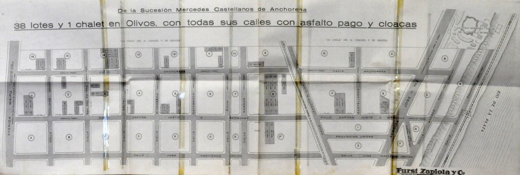 Folleto publicitario del año 1949 que anuncia la venta de treinta y ocho lotes y un chalet, ubicados entre Avenida Maipú y Avenida José C. Paz, hoy Avenida Del Libertador; y las calles José Ingenieros y Tomás Anchorena. Éstos forman parte de la sucesión de Mercedes Castellanos de Urquiza.