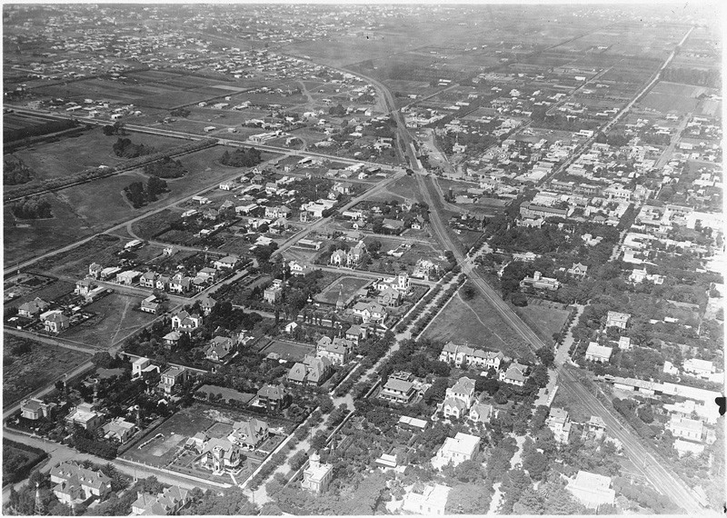 Vista aérea de Olivos hacia el año 1925. A simple vista pueden verse las vías del ferrocarril Bartolomé Mitre, ramal Tigre- Retiro, y la actual Avenida Del Libertador.