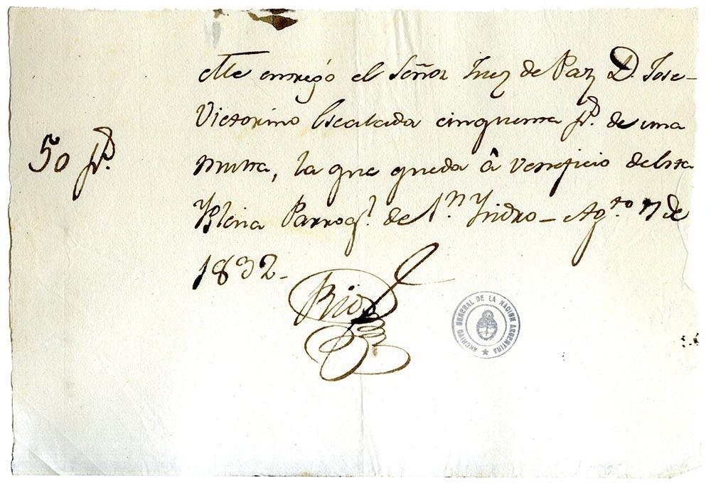 Recibo de dinero a beneficio a favor de la Iglesia Parroquial de San Isidro, agosto de 1832.