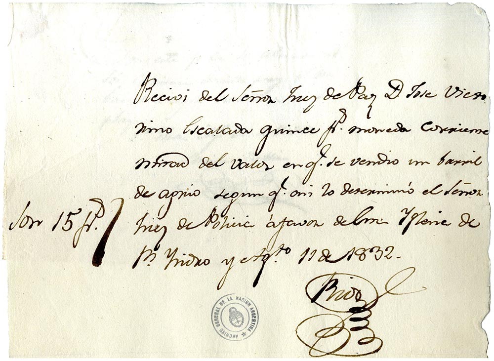 Recibo por venta barril emitido por el juez de Paz y Comisaría del Partido de San Isidro.
