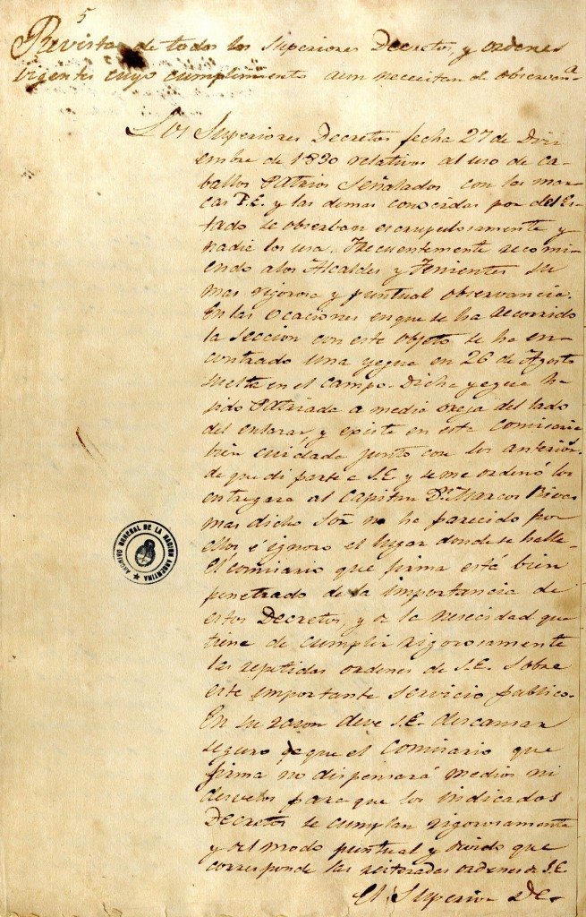Este documento, fechado el 27 de diciembre de 1830, es parte de una recopilación de decretos y órdenes emitidos por las autoridades, cuya observancia era fundamental para garantizar el cumplimiento de normativas esenciales de la época. En este caso, el texto aborda disposiciones relacionadas con el uso de caballos para servicios específicos y las medidas adoptadas para supervisar su aplicación, reflejando la importancia de estas regulaciones como parte del servicio público.