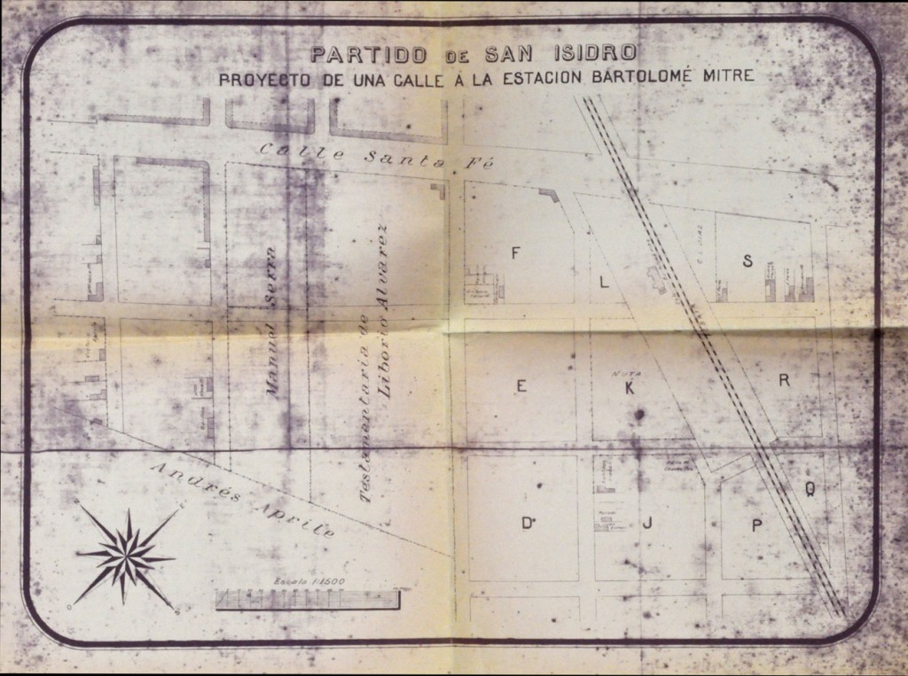Mapa con especificaciones de unidades inmobiliarias de las cercanías de la Estación Bartolomé Mitre (FFCC Mitre-Ramal Mitre-Retiro) para la construcción de una calle anexa a la misma.
