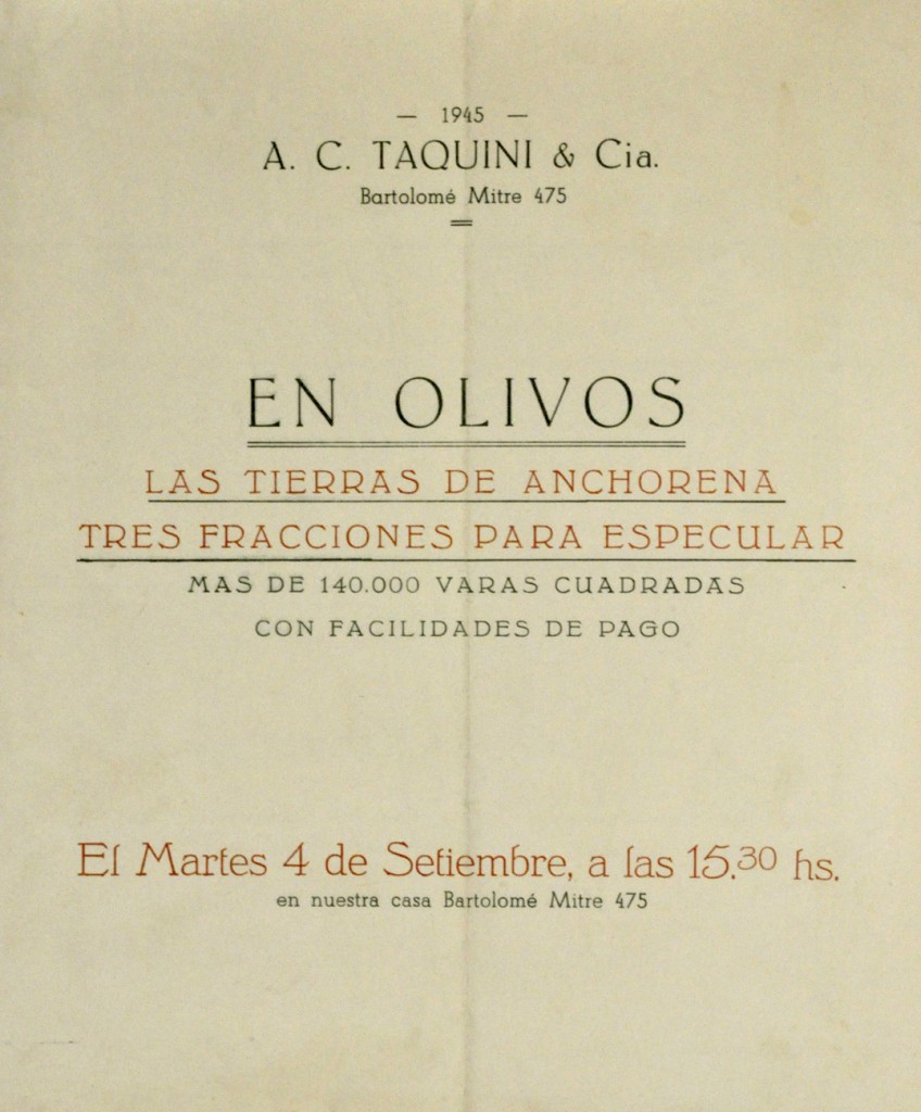 Remate de tres fracciones de tierra en las propiedades de Anchorena, a cargo de A.C. Taquini y Cía.