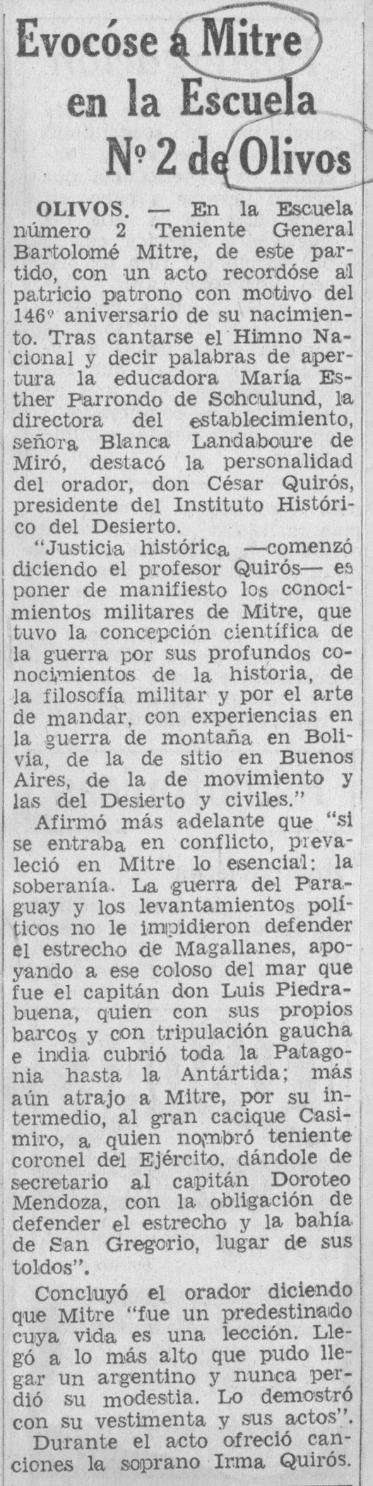 Nota del Diario La Nación, del día 25 de junio de 1968, en donde se hace referencia al homenaje realizado al ex presidente de la Nación Bartolomé Mitre, en la Escuela N.° 2 Benemérto Teniente Gral. Bartolomé Mitre, ubicada en Mariano Pelliza 1390, Olivos.
