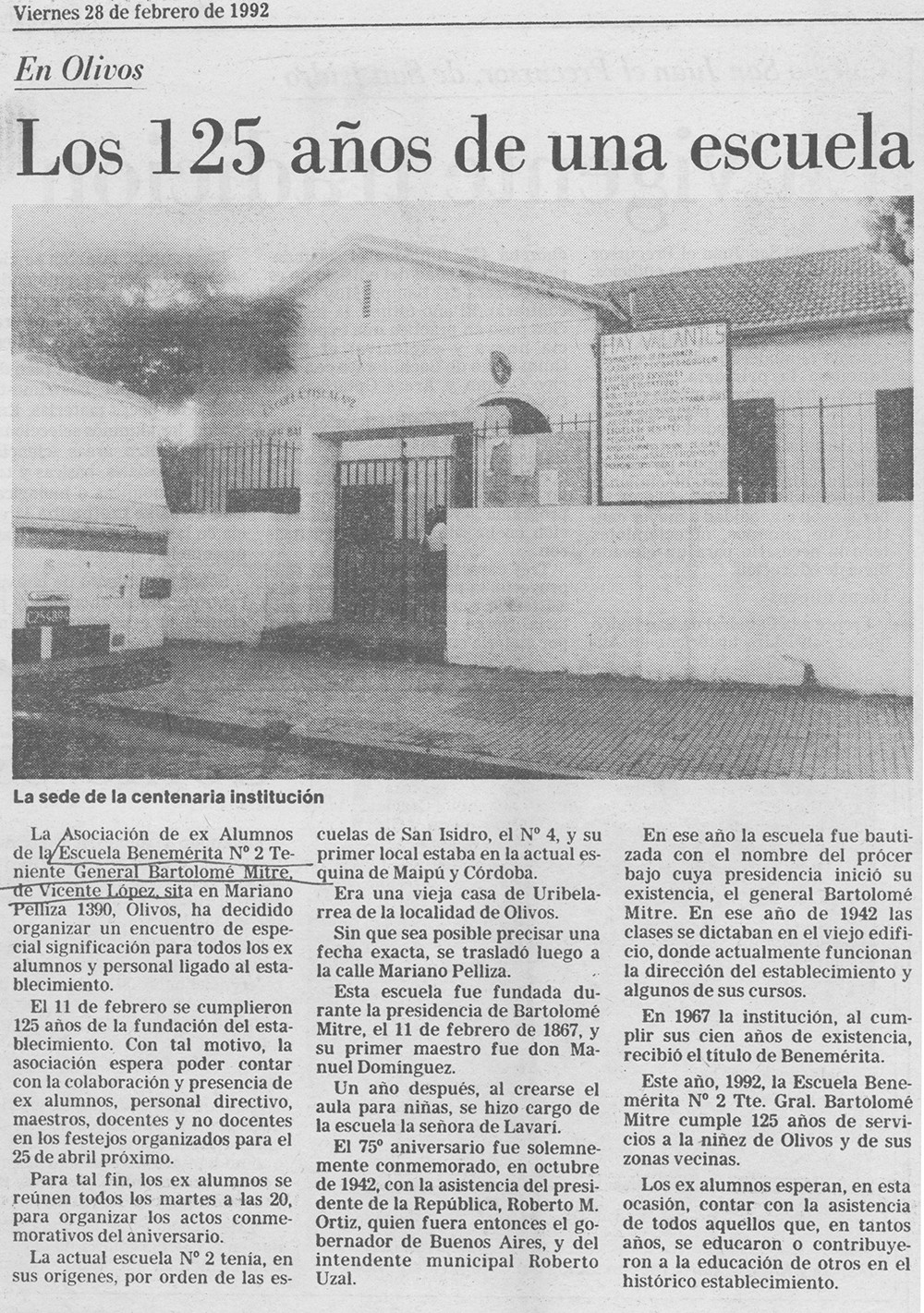 Nota periodística del Diario La Nación, correspondiente al 28 de febrero de 1992, donde se hace referencia al aniversario de la la fundación de la Escuela N.° 2 Benemérito Teniente Gral. Bartolomé Mitre, ubicada en Mariano Pelliza 1390, Olivos.