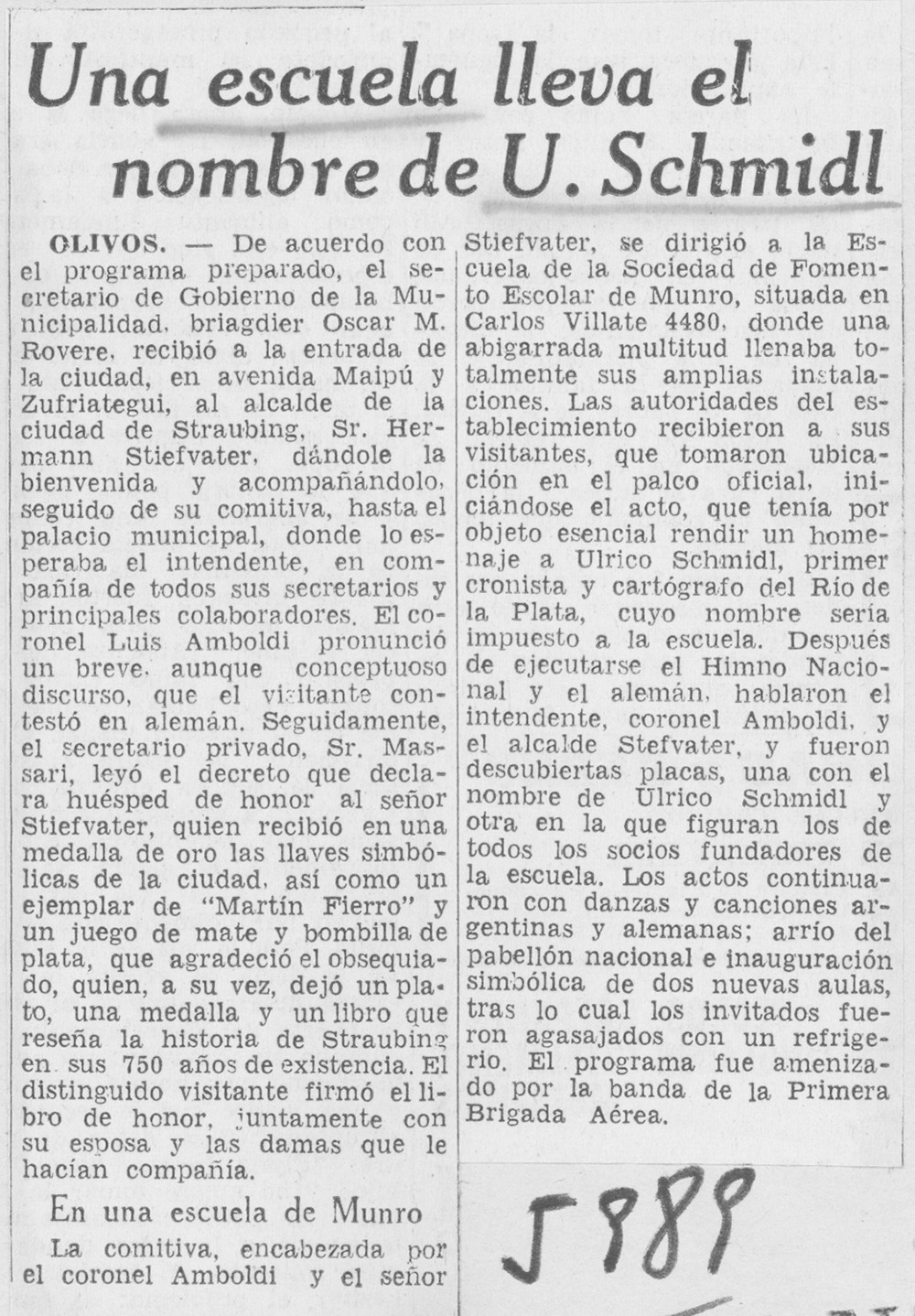 El artículo de La Nación, publicado el 24 de octubre de 1968, describe la ceremonia de inauguración de la Escuela de la Sociedad de Fomento Escolar de Munro en Carlos Villate 4480, la cual recibió el nombre de Ulrico Schmidl, en homenaje al cronista y cartógrafo del Río de la Plata.