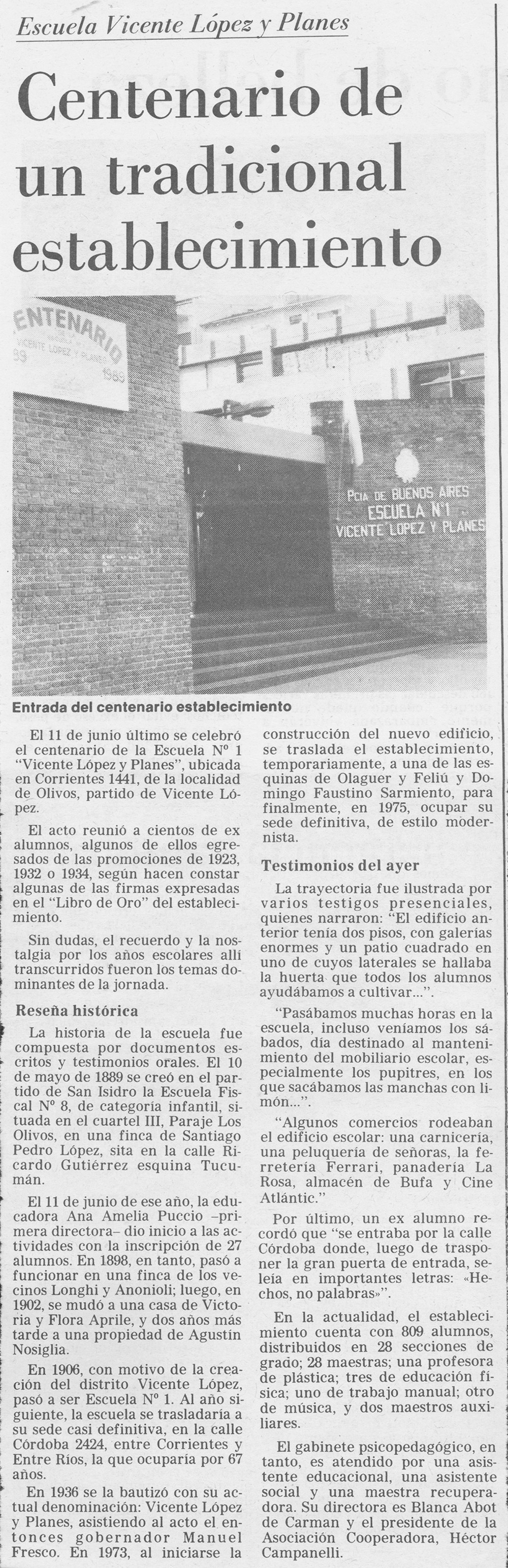 Nota periodística del Diario La Nación de fecha 16 de julio de 1989, en donde se hace referencia al centenario de la escuela N°. 1 Vicente López y Planes.