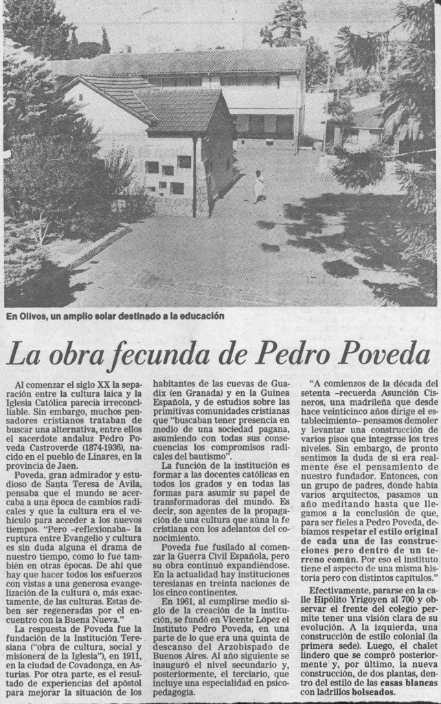 Nota periodística del diario La Nación de fecha 11 de marzo de 1988, que hace referencia a la obra e Instituto Pedro Poveda, fundado en 1961 en una parte de lo que era una quinta de descanso del Arzobispado de Buenos Aires.