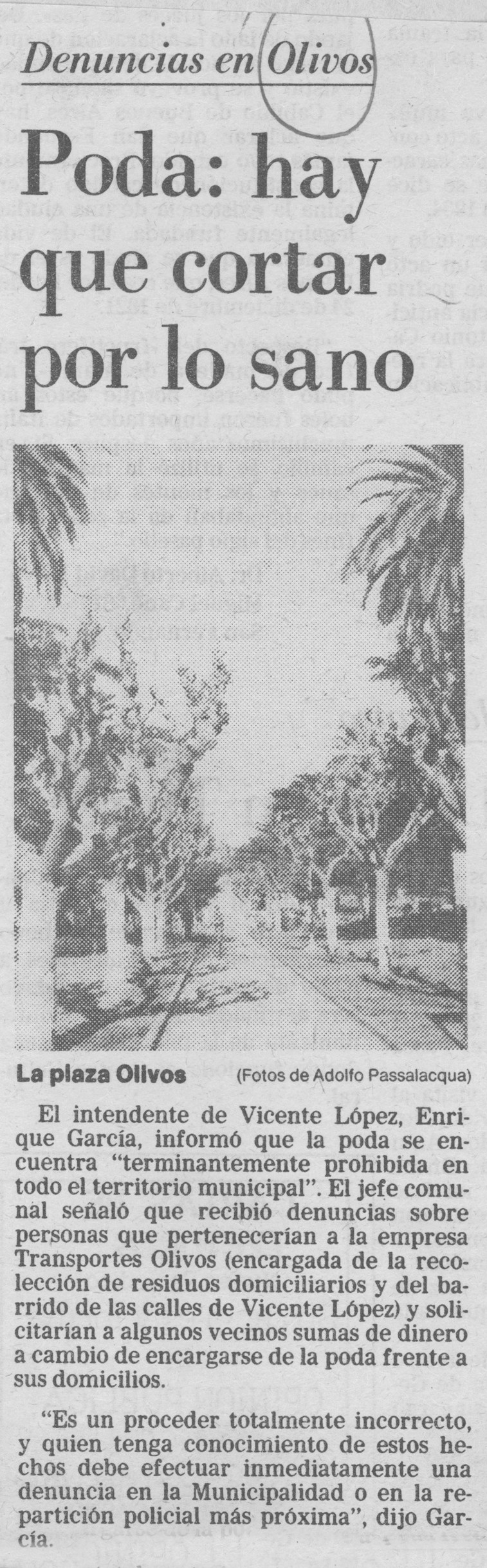 Nota periodística del diario La Nación de fecha 27 de julio de 1990, que hace referencia a denuncias sobre personas que pertenecerían a la empresa Transportes Olivos, y solicitarían a algunos vecinos sumas de dinero a cambio de encargarse de la poda frente a sus domicilios.