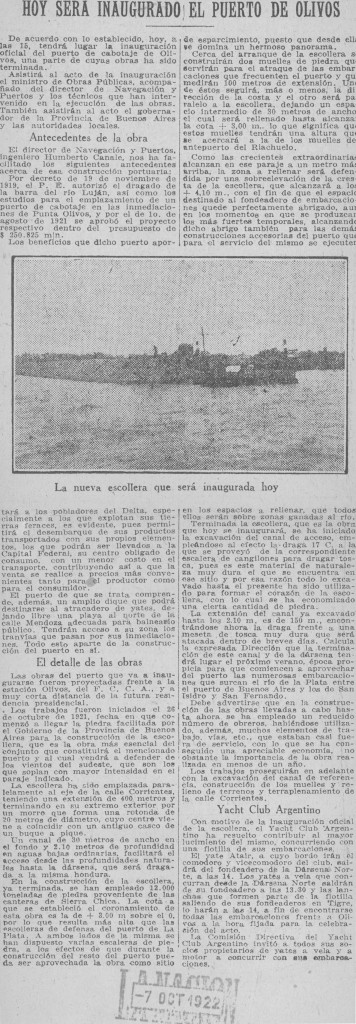 Nota periodística del diario La Nación con fecha del 7 de octubre de 1922, que hace referencia a la inauguración oficial del puerto de cabotaje de Olivos, a la que asistirán el ministro de Obras Públicas, el director de Navegación y Puertos, los técnicos que han intervenido en la ejecución de las obras, el gobernador de la Provincia de Buenos Aires y las autoridades locales.