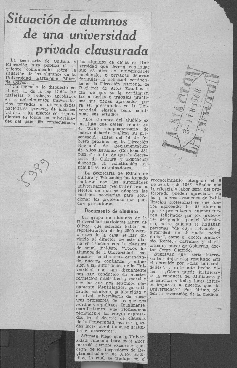 Nota periodística del diario La Nación, con fecha del 3 de febrero de 1968, que hace referencia a un grupo de alumnos de la Universidad Bartolomé Mitre, que señalan hablar en representación de los 2.800 estudiantes de la casa, dirigiéndose al director del diario en relación con la clausura de la Institución.