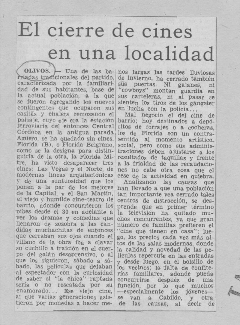 Nota periodística del diario La Nación con fecha del 20 de enero de 1968, que hace referencia al cierre de un cine en la localidad de Florida, Vicente López.