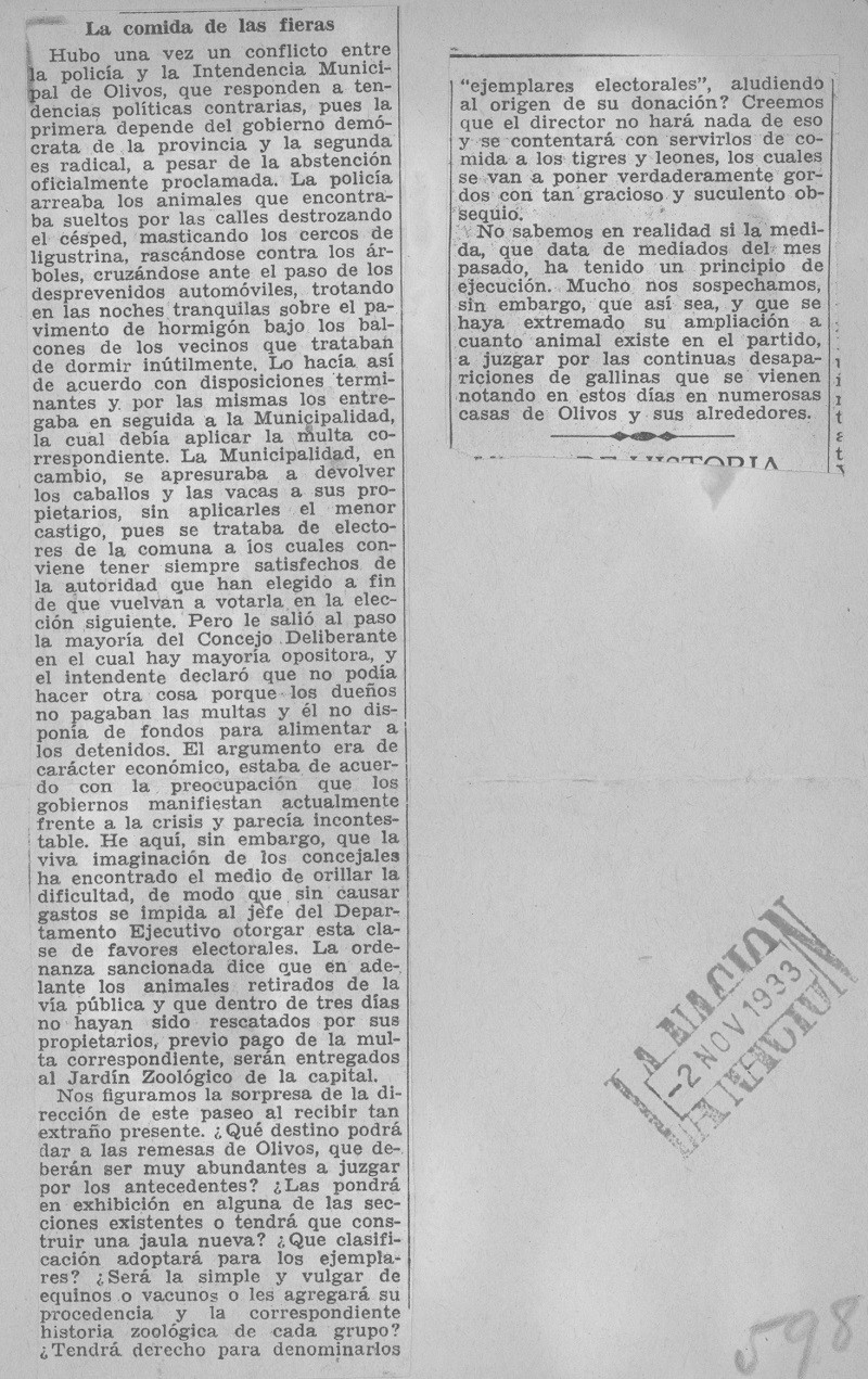 El artículo, publicado en La Nación el 2 de noviembre de 1933, aborda un conflicto entre la Policía, que respondía al gobierno demócrata de la provincia, y la Municipalidad de Olivos, liderada por el radicalismo, en el contexto de elecciones locales. Destaca la disputa sobre el manejo de animales sueltos en la vía pública, que causaban daños y molestias en la zona.