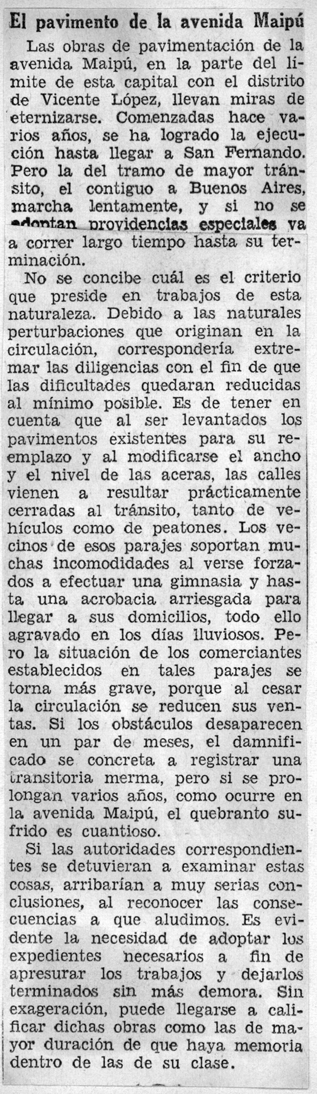 Artículo del diario La Nación de 1941 sobre las demoras en las obras de pavimentación de la avenida Maipú. La nota destacaba los inconvenientes generados por los trabajos inconclusos, que afectaban el tránsito, el acceso a las viviendas y el comercio local. También subrayaba la urgencia de acelerar las obras debido a su importancia estratégica para la región.