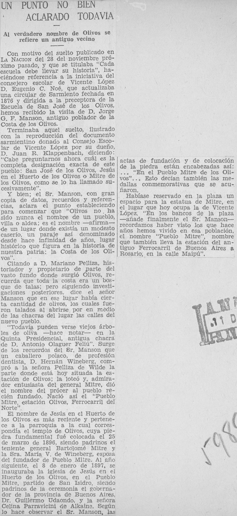 Carta de lectores publicada en el diario La Nación el 11 de diciembre de 1939 aborda el origen del nombre de Olivos.