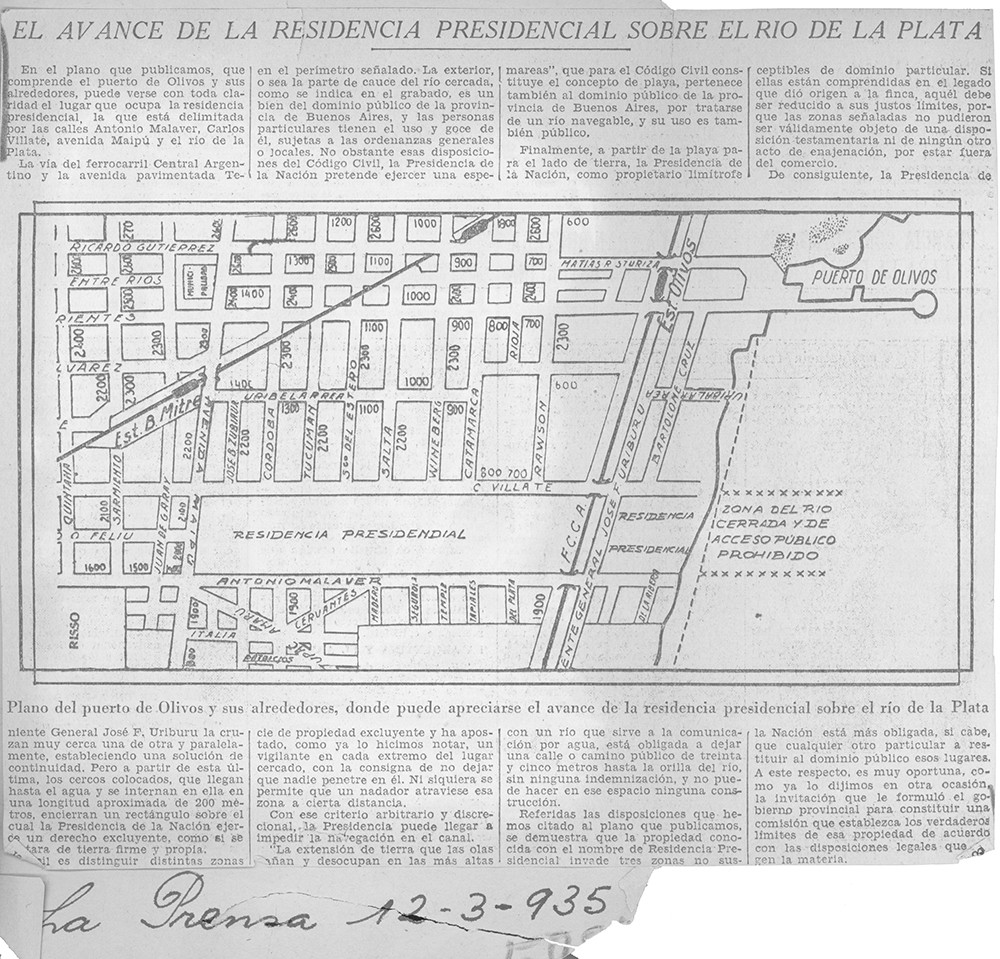 Nota periodística del diario La Nación con fecha del 12 de marzo de 1935, que hace referencia al plano de la Quinta Presidencial demostrando que la propiedad invade tres zonas no susceptibles de dominio particular, debiendo reducirlas a sus justos limites.