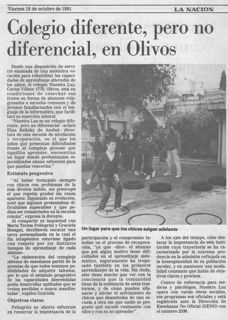 Nota periodística del diario La Nación con fecha del 18 de octubre de 1991, que hace referencia a la escuela Nuestra Luz, una escuela de nivelación y recuperación, en la que los niños que presentas dificultados frente al complejo proceso que significa aprender, encuentran un lugar donde profesionales especializados aúnan esfuerzos para que puedan vencerlas.