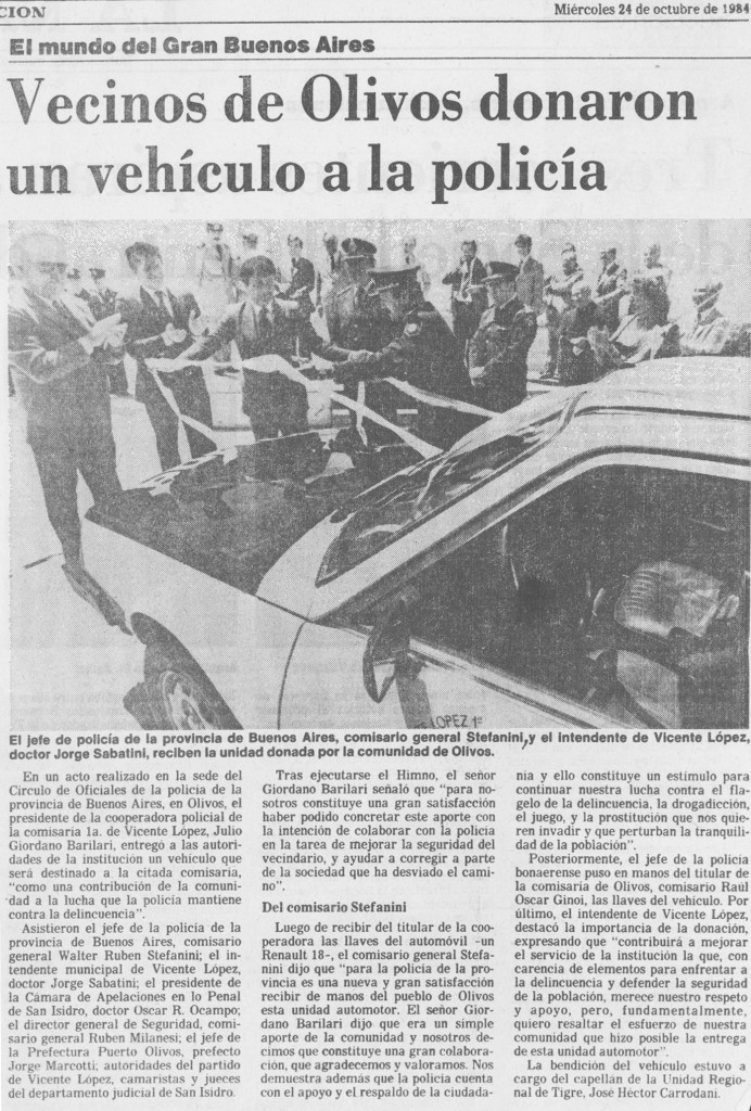 Nota periodística del diario La Nación con fecha del 24 de octubre de 1984, que hace referencia a la donación, por parte de los vecinos de Olivos, de un vehículo policial que reciben, el jefe de policía de la Provincia de Buenos Aires Comisario General Stefanini, y el intendente de Vicente López, Jorge Sabatini.
