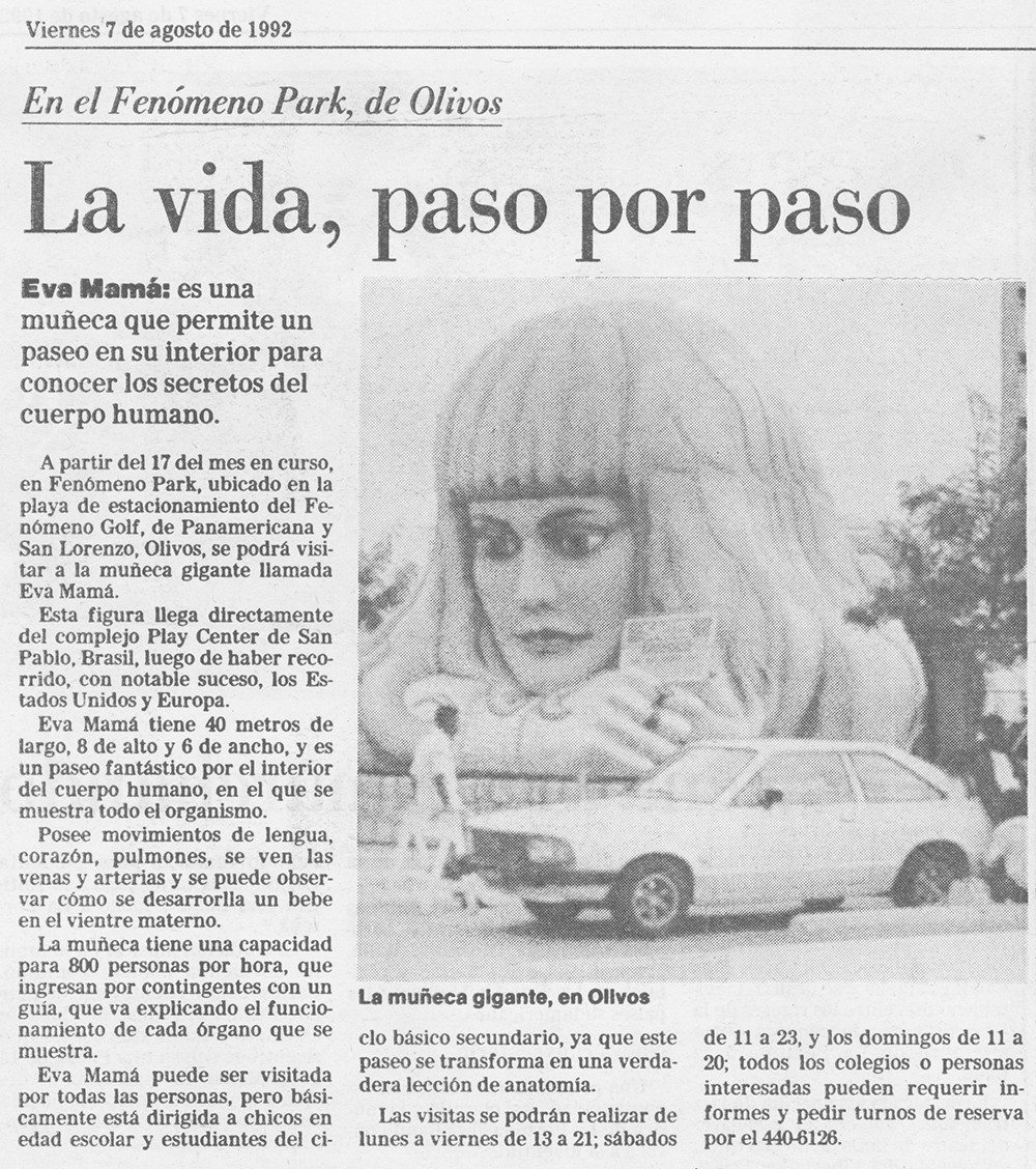 Nota periodística del diario La Nación con fecha del 7 de agosto de 1992, que hace referencia a Eva Mamá, una muñeca gigante ubicada en la playa de estacionamiento del Fenómeno Golf, de Panamericana y San Lorenzo, Olivos.